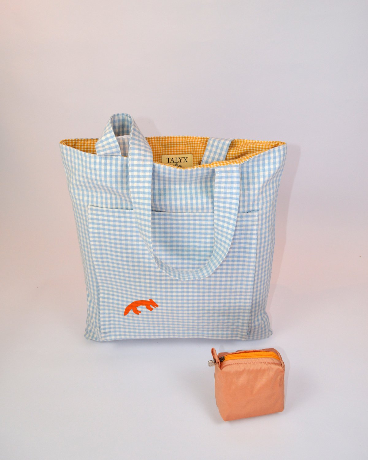 Our 100% Linen Baby Blue Gingham Carry-All Bag comes with our signature hand carved Gobeklitepe Fox print in 38×32 cm dimensions. Can be used double-faced since the inside of the bag is layered with cotton yellow gingham.