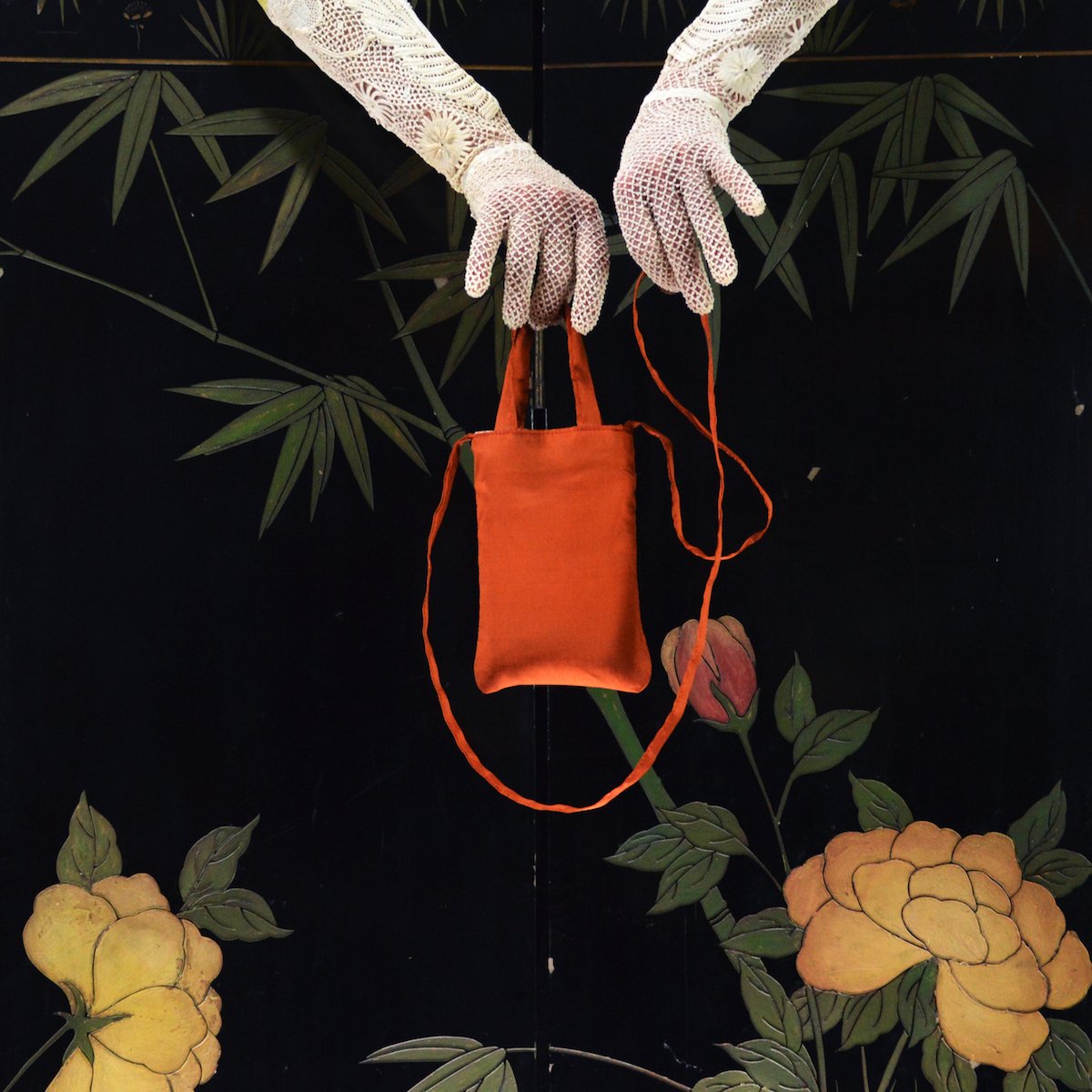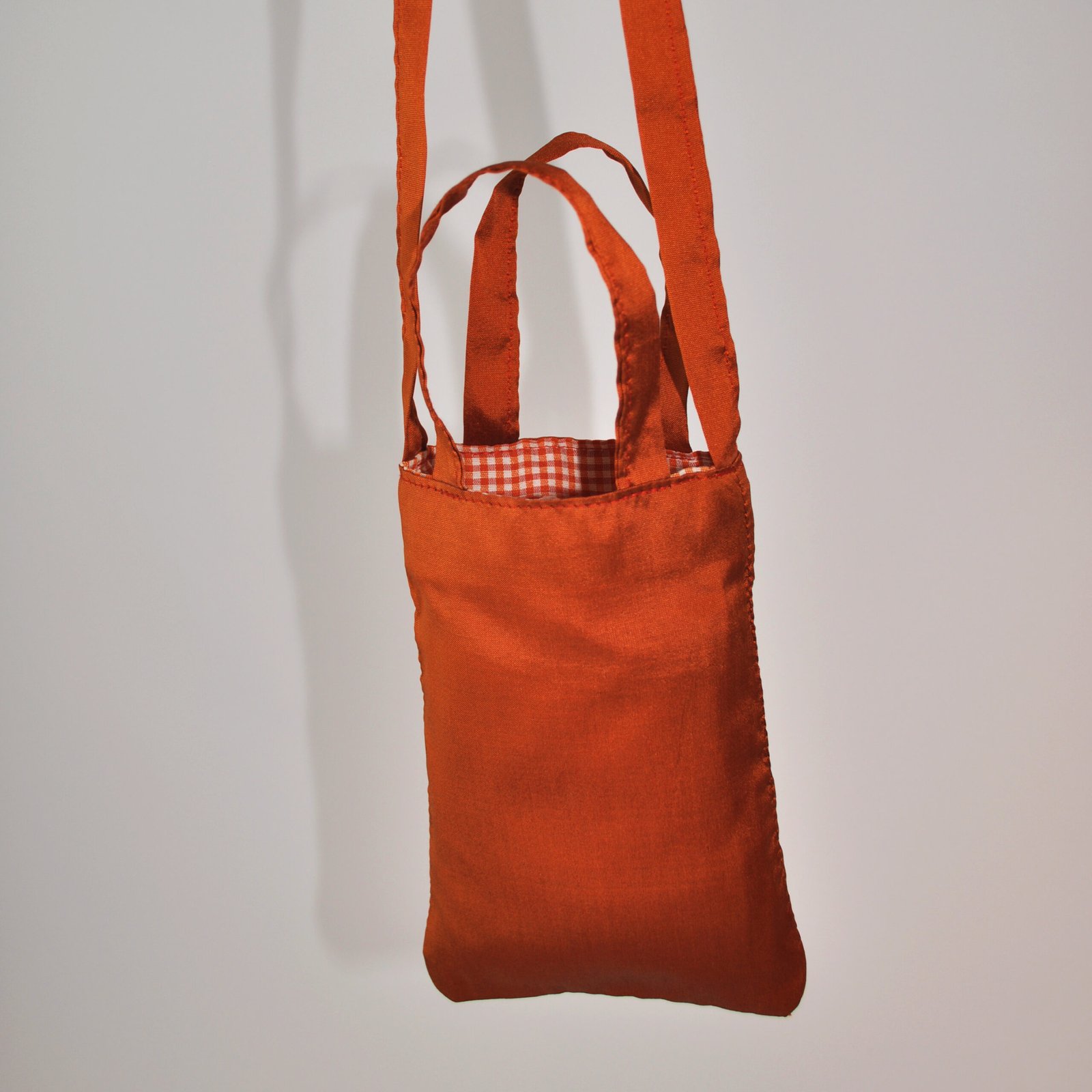 Our Burnt Orange Crossbody Coquette comes double faced, the pocketed side layered with orange gingham, fits in all your daily essentials deliciously. You can either wear it cross-body or you can let your coquette bag swing along on your wrists, through the day and night.