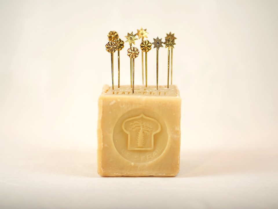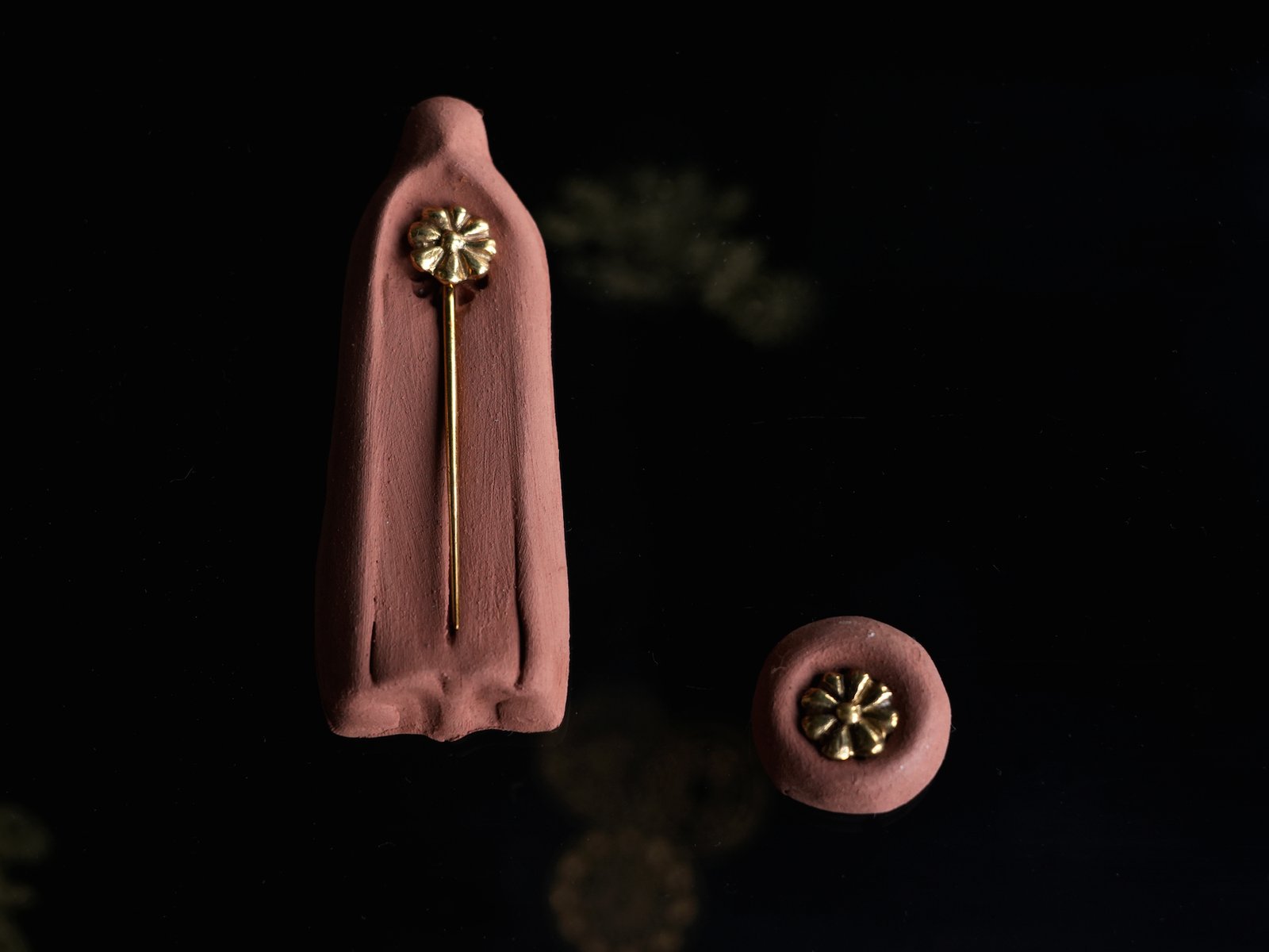 Material is hand cast amalgamated bronze and brass, the length of the pin is 6.5 cm.