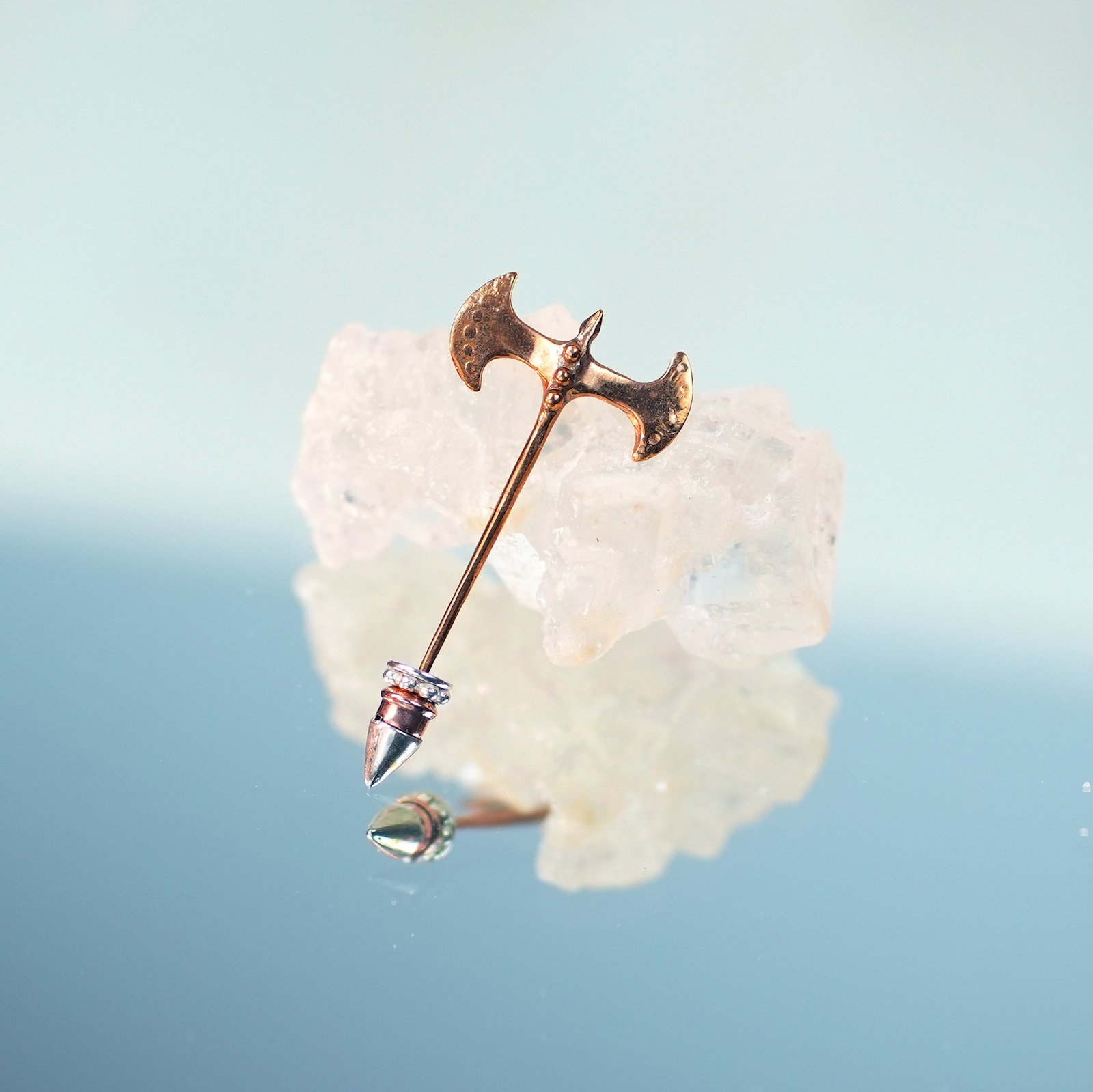 This Labyris – Double Axe Pin comes in pink bronze with a sturdy and handmade silver pin locket at the bottom.