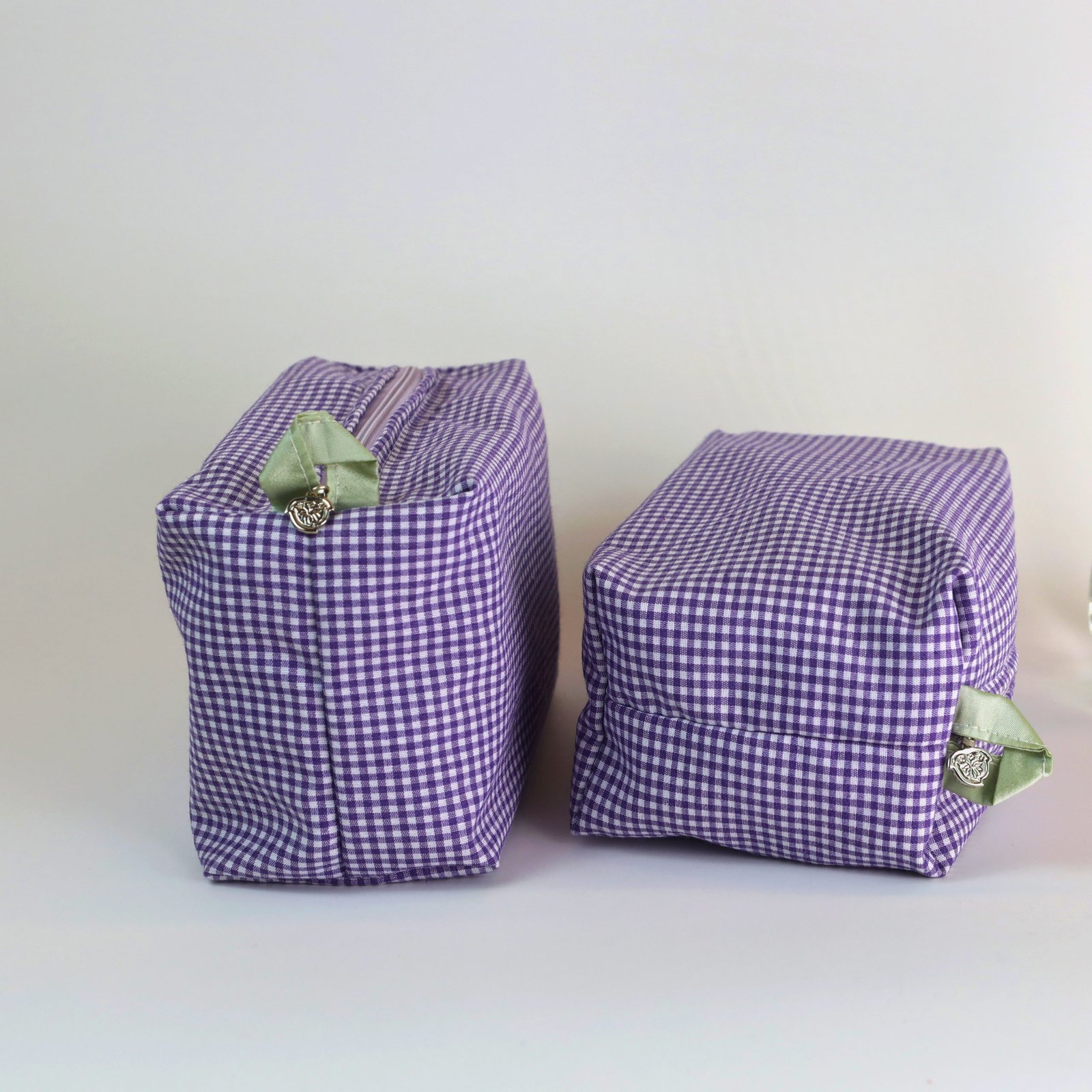 Our Lavender Mini GinghamVanity Cases have the perfect form to use as a toiletry bag, travel purse or even a pencil case.They come with our signature peach charm at the zipper ends, layered with Nile green Shantung inside to keep everything in its right place.