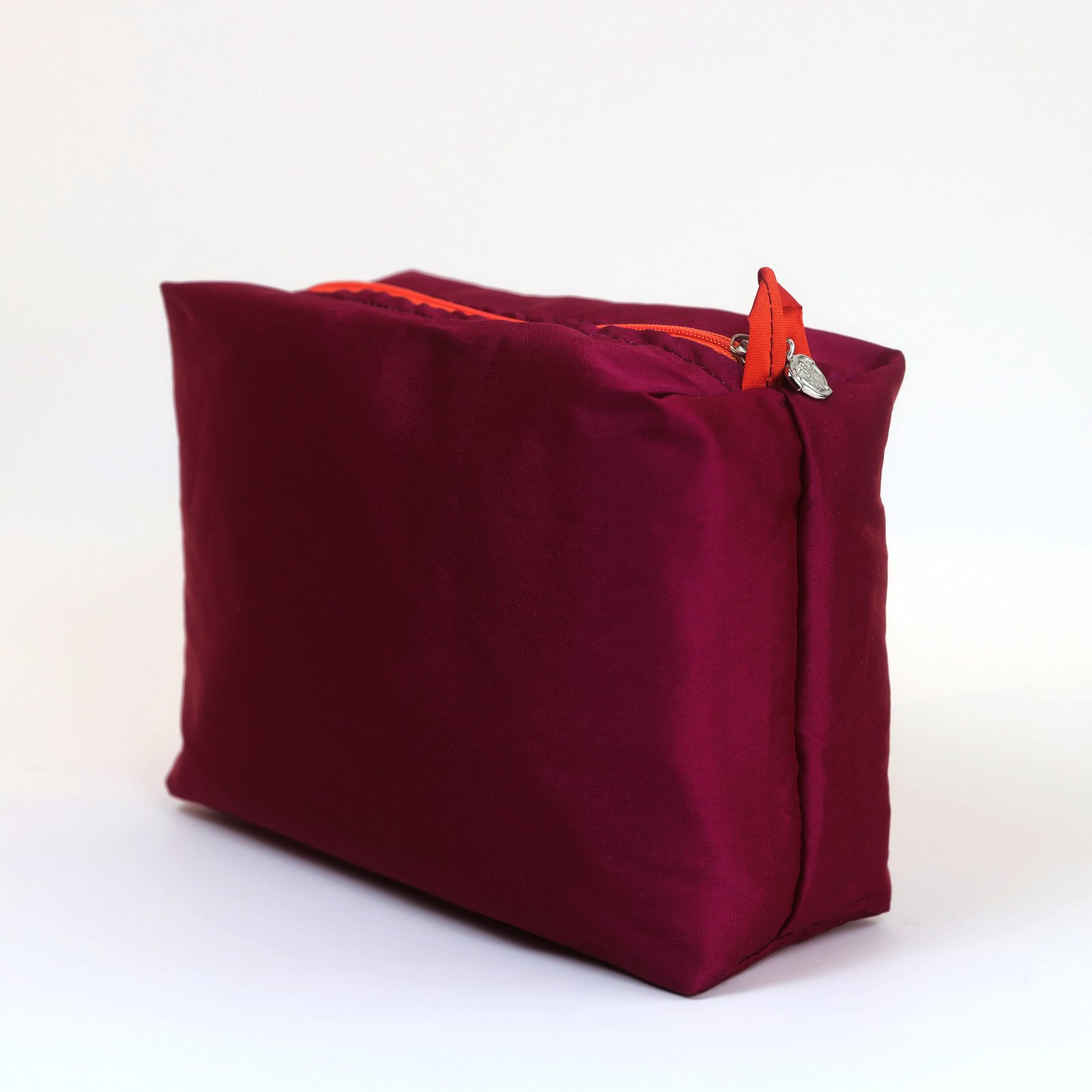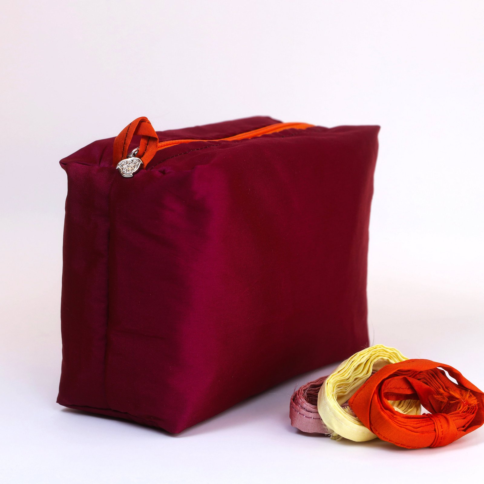 Our Ruby Shantung Vanity Cases have the perfect form to use as a toiletry bag, travel purse or even a pencil case. They come with our signature bronze-cast, silver plated peach charm at the zipper ends to keep everything in its right place.